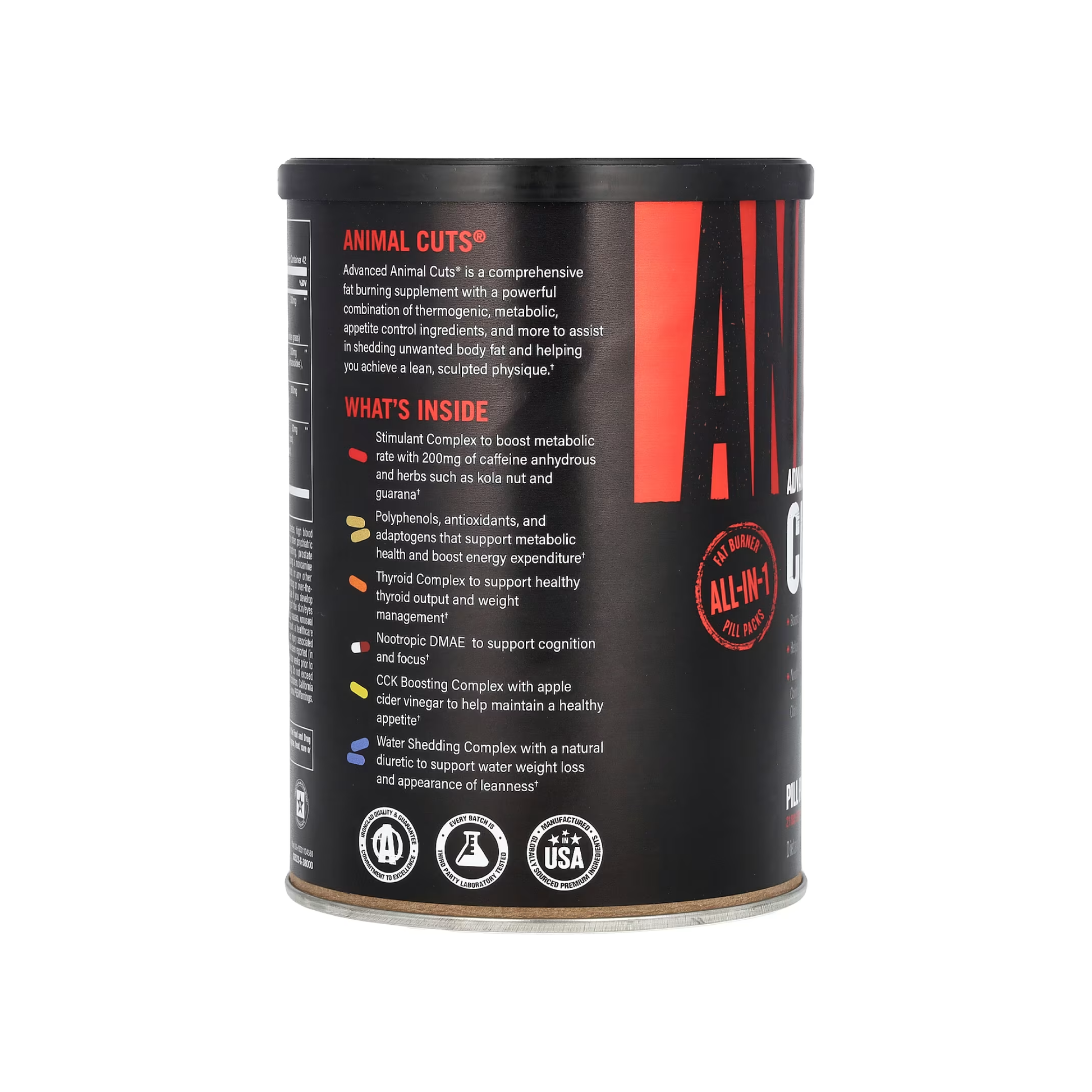 Animal Cuts Advanced, yağ oranını düşürürken kas kütlesini korumak isteyen sporcular için geliştirilmiş çok yönlü bir termojenik destek ürünüdür. Her pakette metabolizmayı, tiroid fonksiyonlarını, su atılımını ve mental odağı destekleyen bileşenler sinerjik şekilde bir araya getirilmiştir.