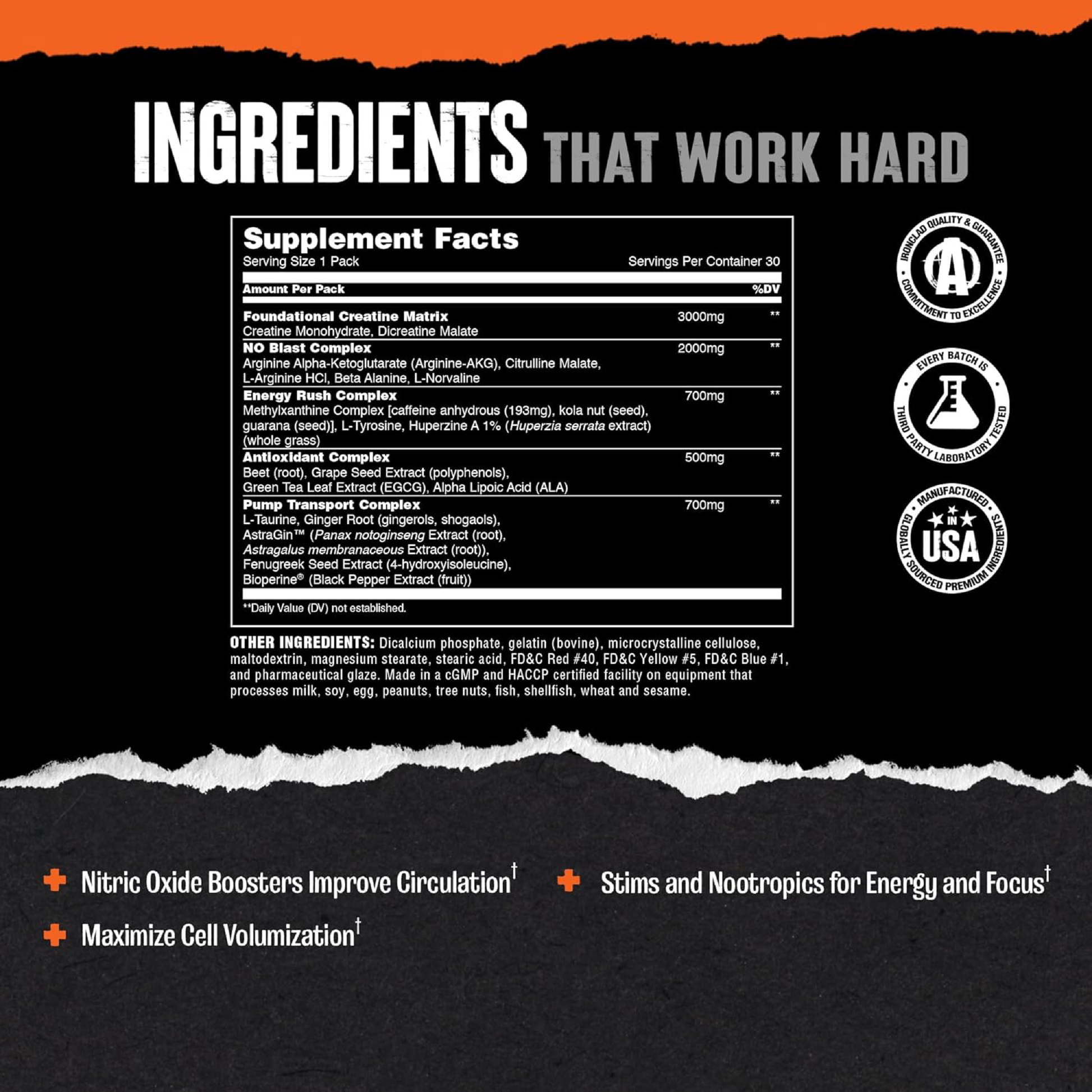 Özel formülü sayesinde kaslara daha fazla oksijen ve besin taşınmasını sağlar, bu da daha yoğun, uzun süreli ve verimli antrenmanlara olanak tanır. İçeriğinde yer alan kafein kapsülü, uyarıcı hassasiyeti olanlar için paketten çıkarılabilir şekilde tasarlanmıştır.
